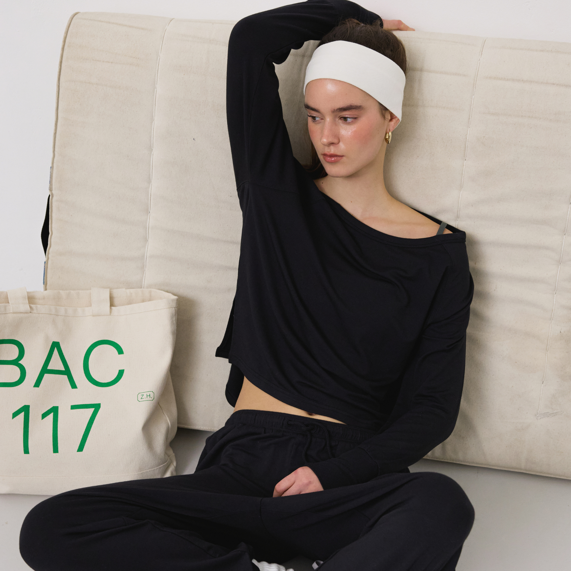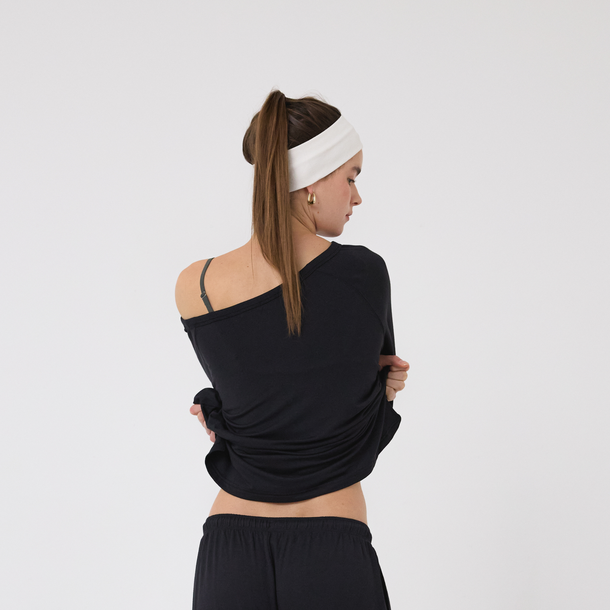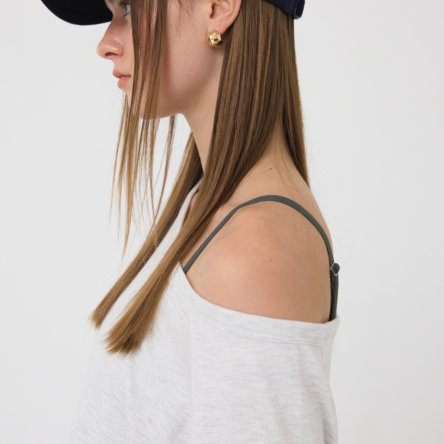 デコルテを綺麗に見せるオフショルダーと、伸びの良いリブ素材で着心地抜群。